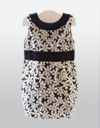 Vestido en fina seda negra con flores color perla. Detalle de seda negra en cuello y cinturón, bolsillo ojal a los costados.